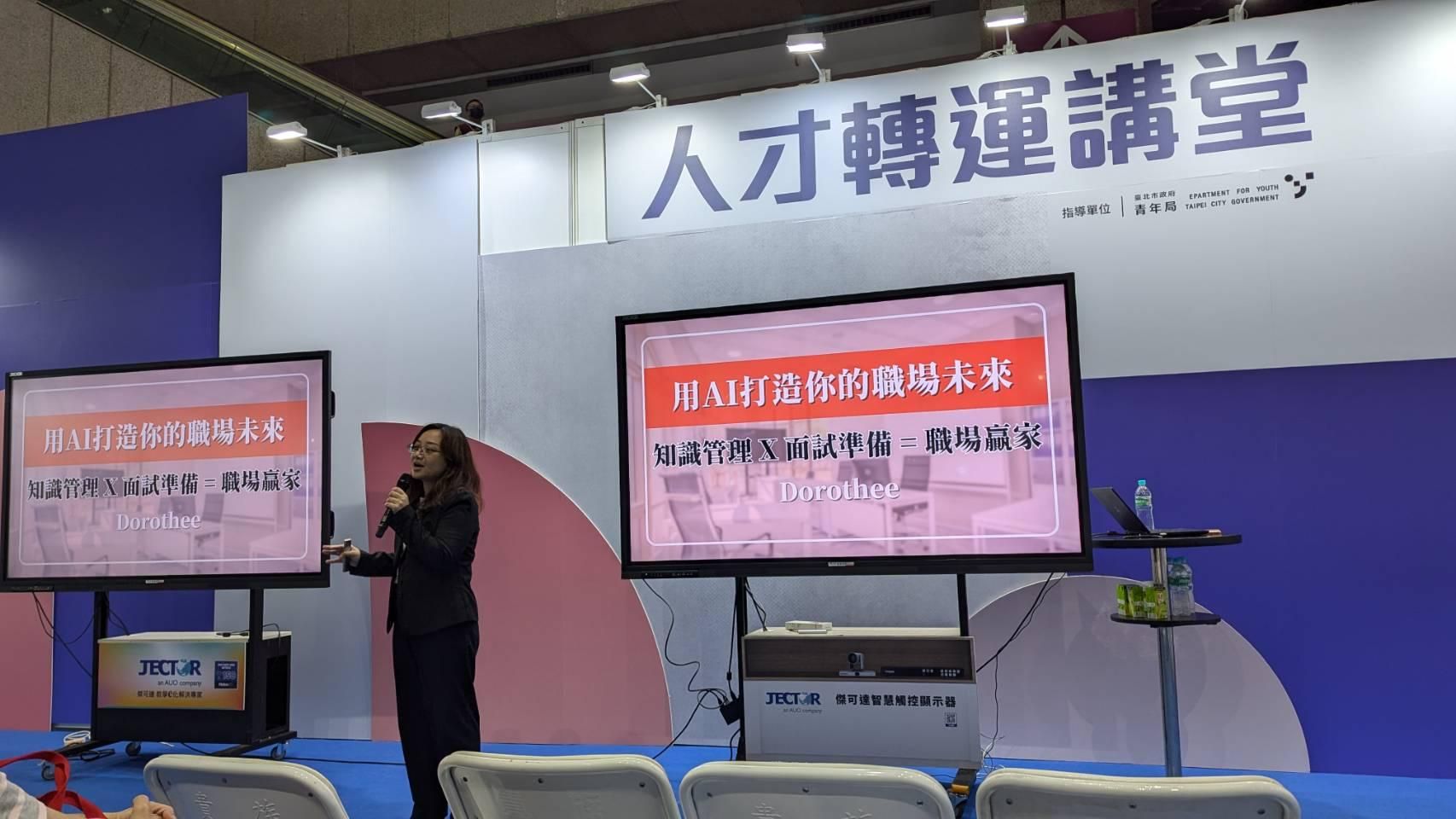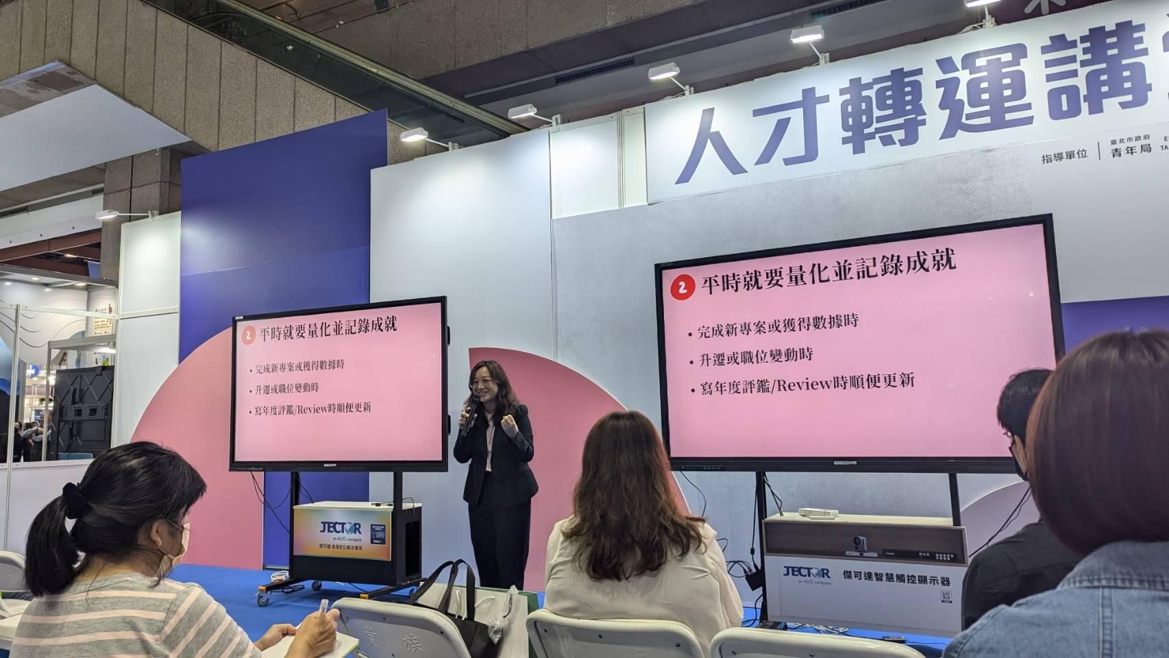 會場是一個ㄇ字型攤位,當天展場同時有許多其他攤位進行活動,人潮來來去去。另一個主題是臺灣教育科技展,所以有不少爸爸媽媽帶著小朋友一起參加。剛開始入場的觀眾年齡層很廣,有20多歲的年輕人,也有40到50多歲的中年族群,觀眾相對分眾。我講的主題針對職場人士的知識管理與面試求職,因此需要靈活應變,根據現場情況調整互動的方式。這部分對我來說是相當具有挑戰的,我也在努力學習和累積這方面的經驗。